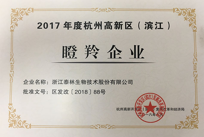 泰林生物连续3年获评高新区(滨江)瞪羚企业称号