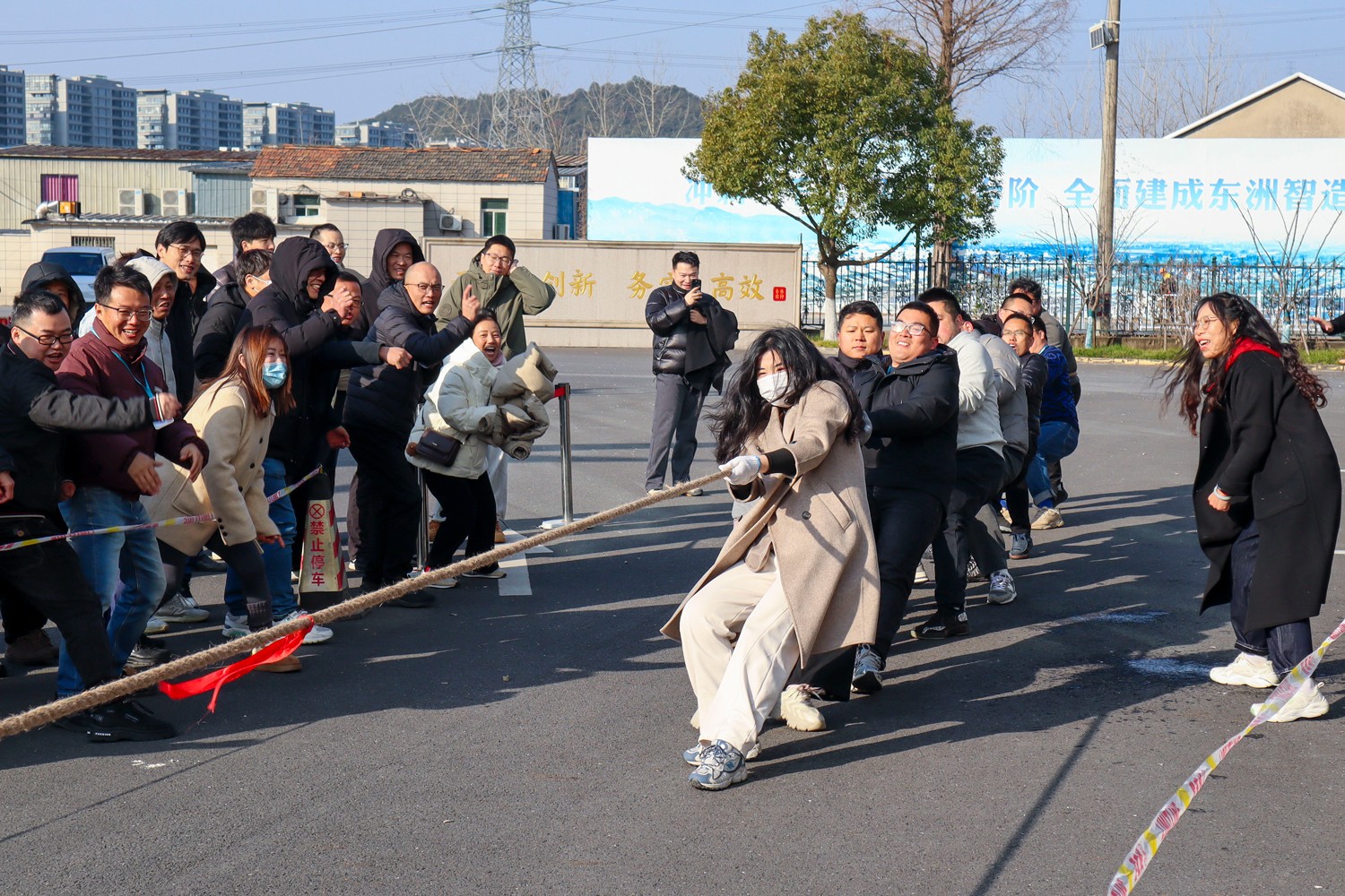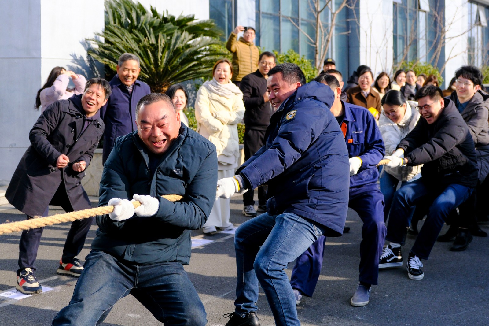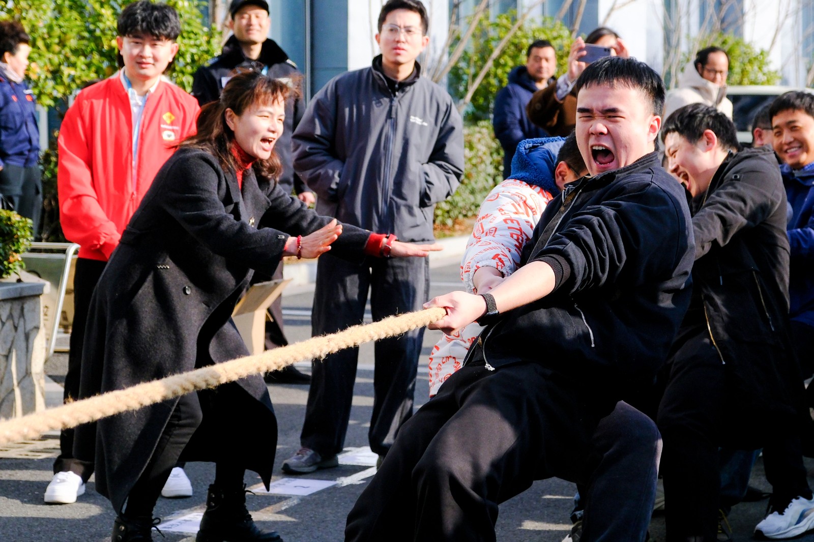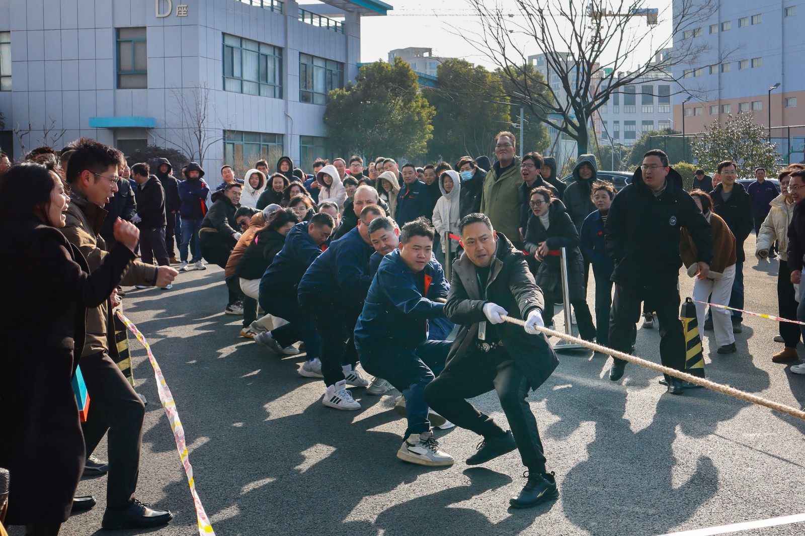 随着裁判员的一声清脆哨响,两大园区的拔河比赛正式打响。参赛队员们起绳、拉紧、挺身、开拔,瞬间的爆发力冲向云霄,各个憋的面红耳赤,使出了浑身力气,大家一起“一二一二”的喊着口号,卯足劲往一处使,将力量拧成一股绳,团结一致、顽强拼搏。场边啦啦队们也不甘示弱,呐喊声、助威声一波一波冲击着赛场,气氛热烈愉悦。