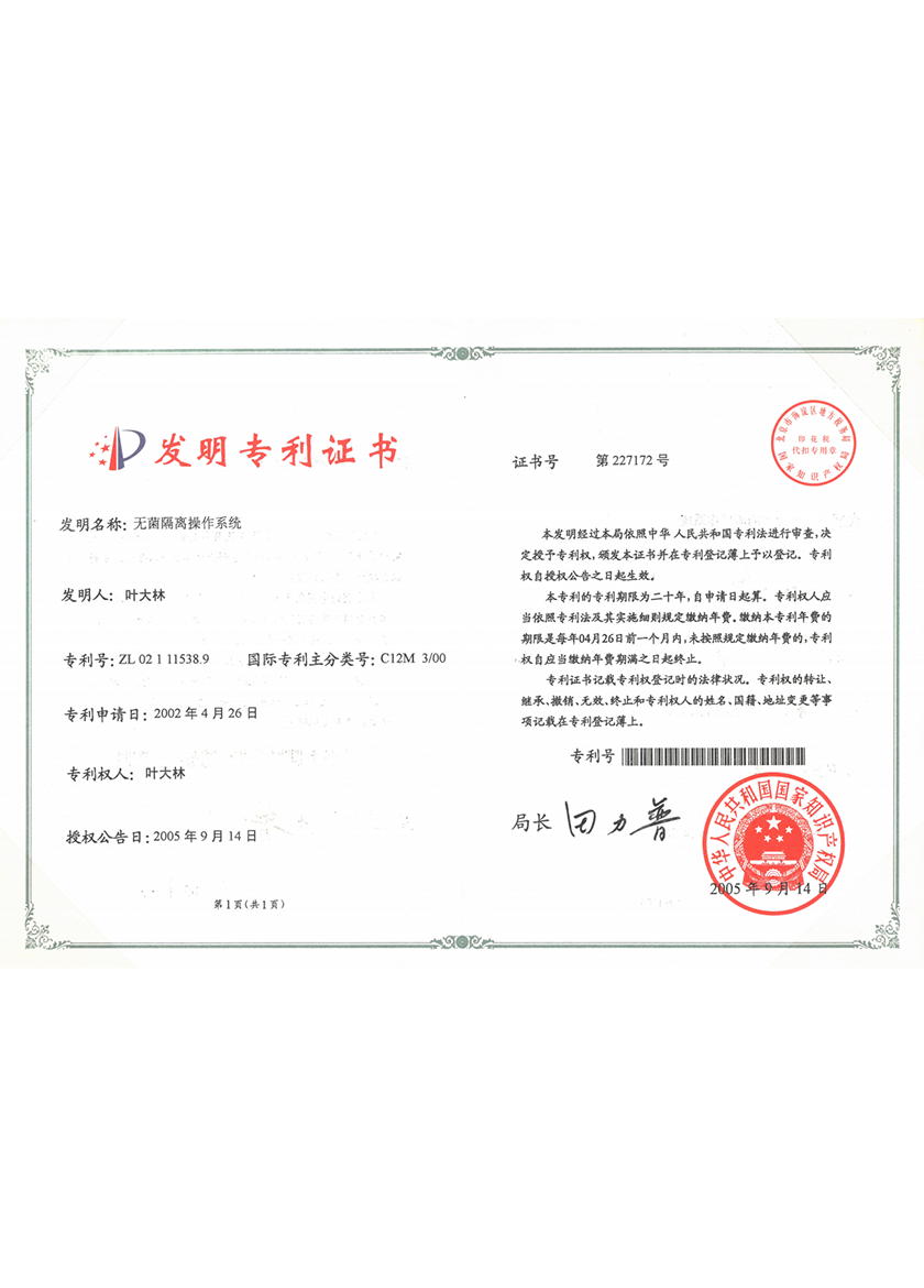 无菌隔离操作系统ZL02111538. 9 -