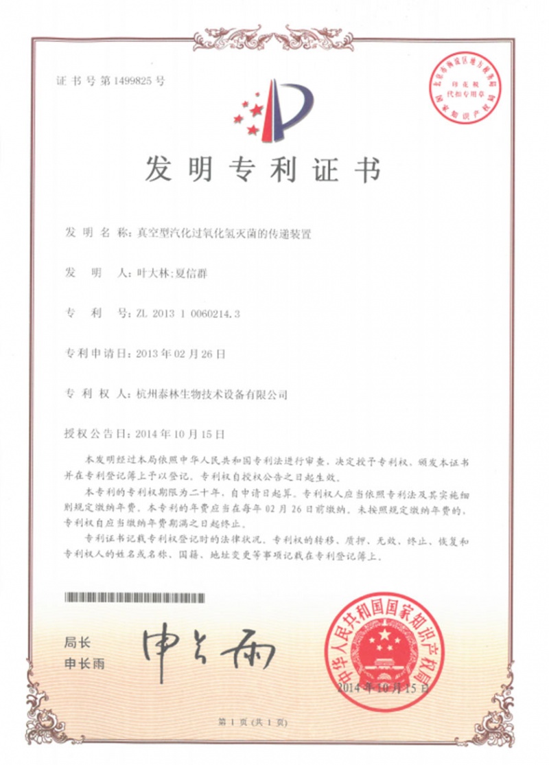 真空型汽化过氧化氢灭菌的传递装置ZL 2013 1 0060214.3 -