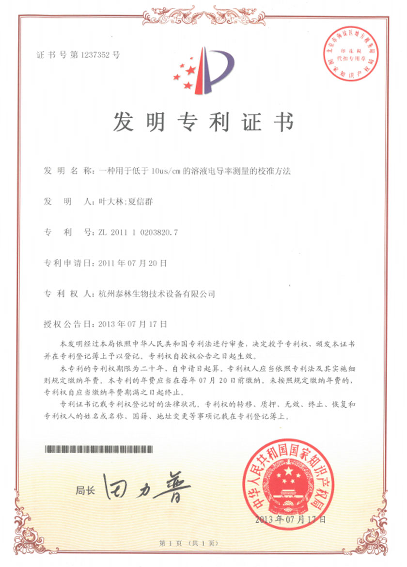 一种用于低于10us/cm的涫寝电导率测量的校准方法ZL 2011 1 0203820.7 -